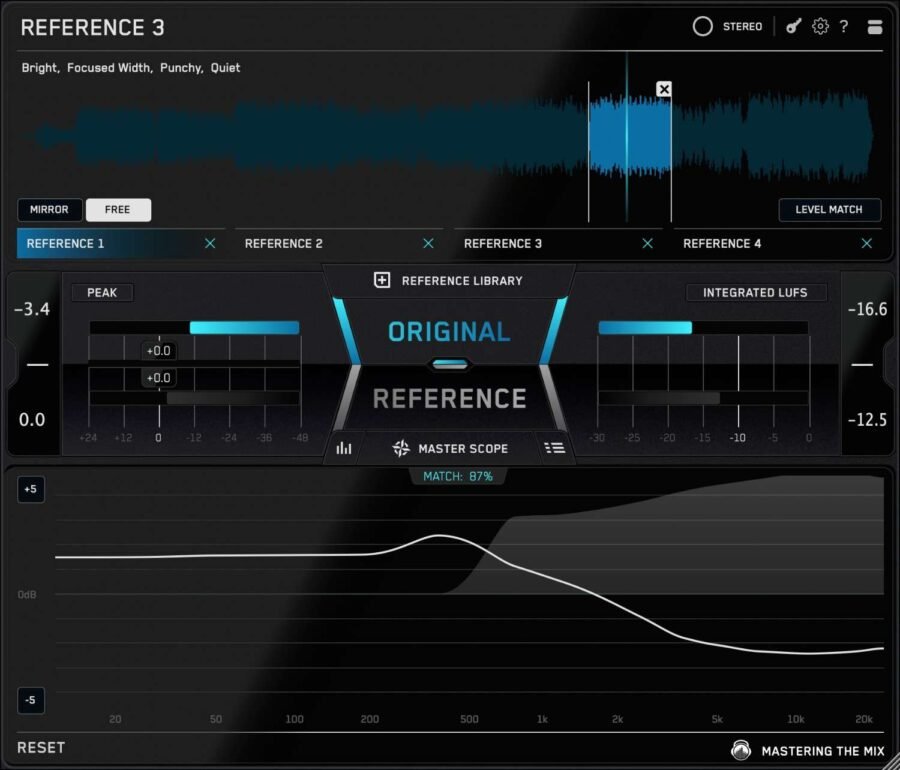 Every comparison is level matched, so you can make honest decisions based on sound, not loudness. REFERENCE 3 also includes Master Scope, which shows the exact EQ and stereo width adjustments needed to match your reference track, while also highlighting phase issues and over-compression.